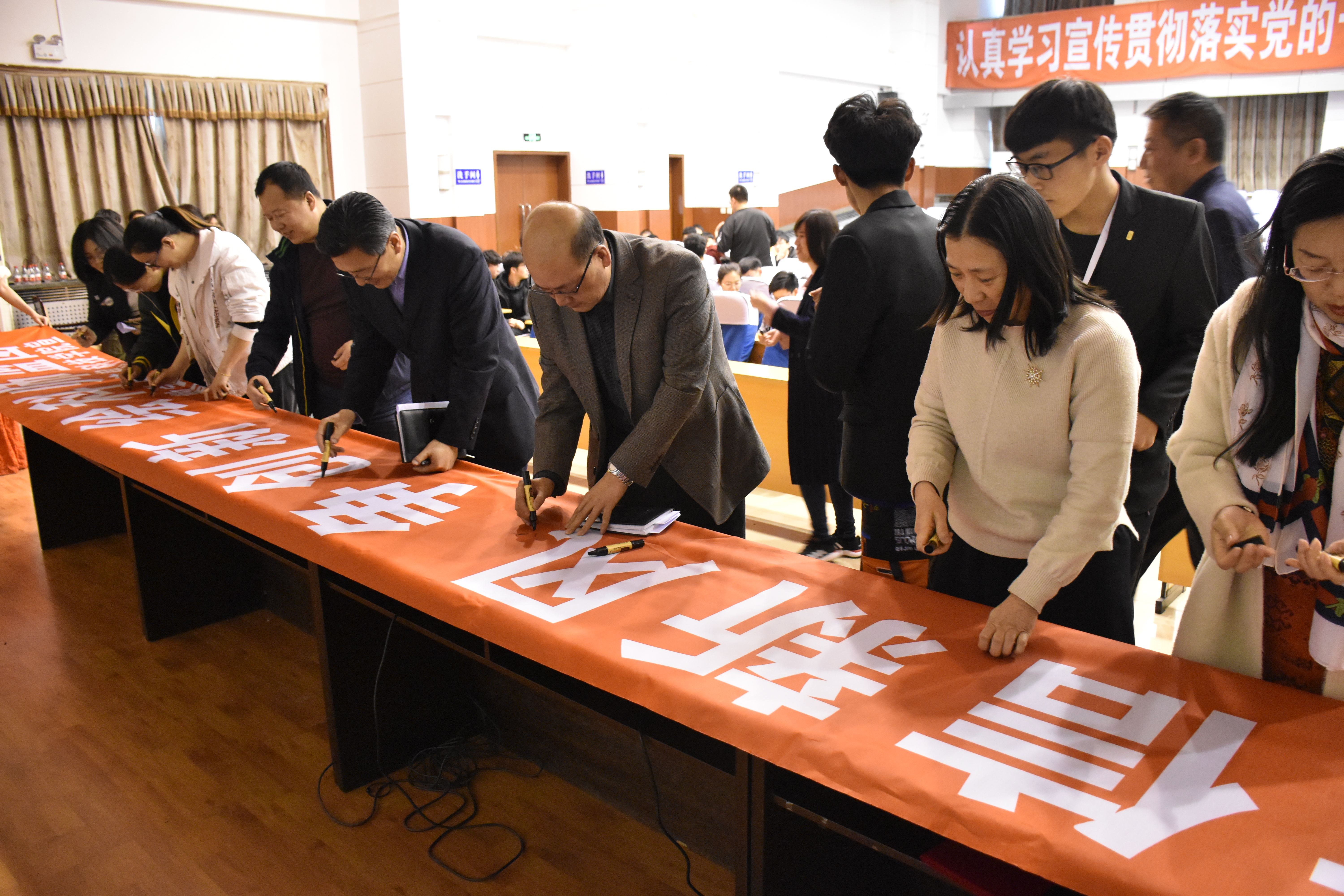 全体师生在条幅上承诺签字