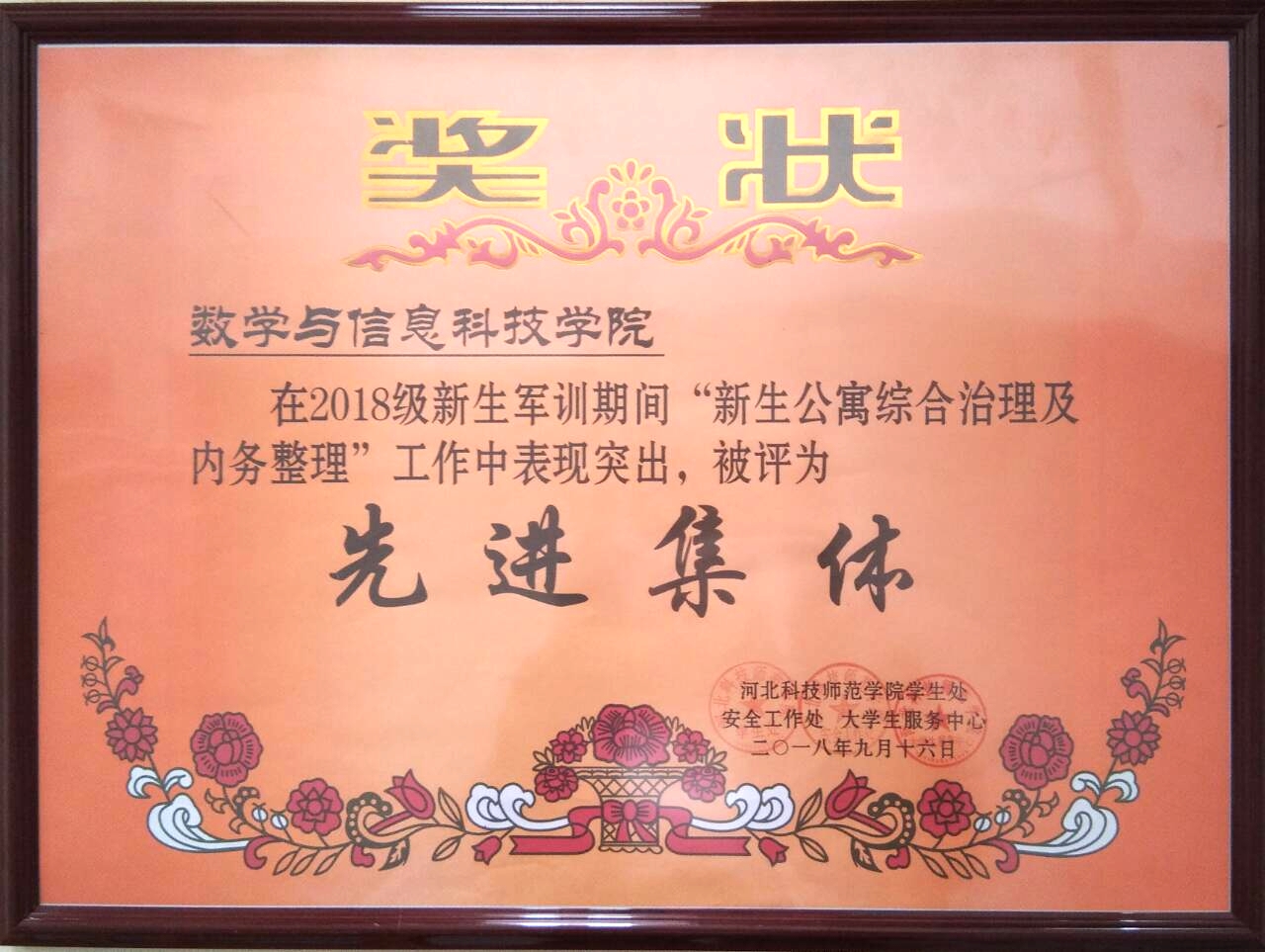 军训期间,全体同学们,在教官和老师的领导下,他们发扬部队军人流血流汗不流泪,掉皮掉肉不掉队的吃苦精神,不惧骄阳,刻苦训练;同时,公司领导、新生班主任及全体新生积极投身公寓综合治理及内务整理活动中,经过公司、公司多次检查评比,公司有30个宿舍被评为公司先进宿舍,经过师生的共同努力,k1体育在2018级新生军训期间公寓综合治理及内务整理考评工作中又获佳绩,连续三年获得先进集体殊荣。